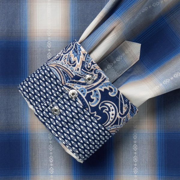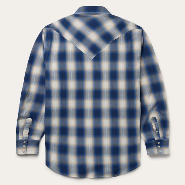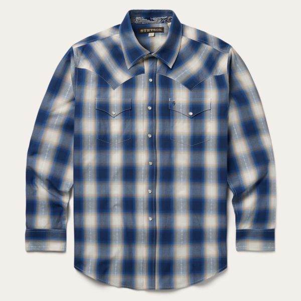 This western shirt is crafted from yarn dyed 100% cotton dobby and features our exclusive Blue Ombre plaid with satin stitch. It has a one point ultra deep curved back yoke, logo pearl snap front, multiple inside trim fabrics and three snap cuffs. The front left pocket is embroidered with the Stetson S” logo and the right sleeve placket is embroidered with STETSON.