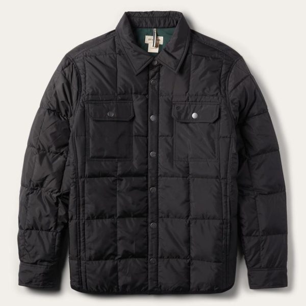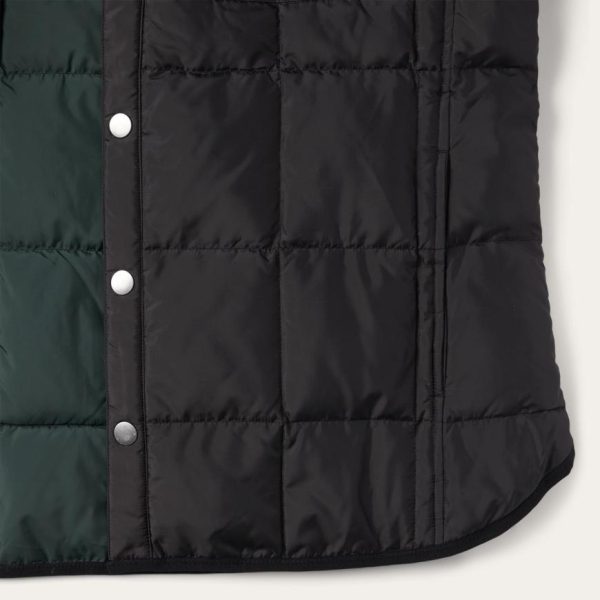 This versatile jacket is lightweight and fully crushable for easy traveling. Filled with down. it has a high warmth to weight ratio so you’re always prepared if the weather goes south. The neutral pure black exterior pairs with anything, while the hunter green interior provides a subtle contrast. Further details include welt pockets, adjustable snap cuffs and a snap front with antique nickel snaps.