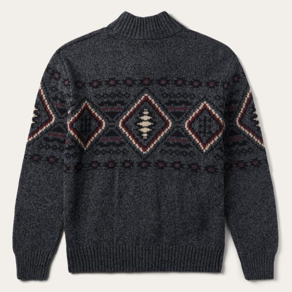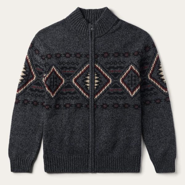 This charcoal gray zip-front cardigan features an exclusive horizontal Aztec-inspired design on its front, back and sleeves. It has two side pockets and a self-knitted collar, cuffs and waistband. Made from a wool blend, it provides warmth, comfort, and a dose of rugged style.