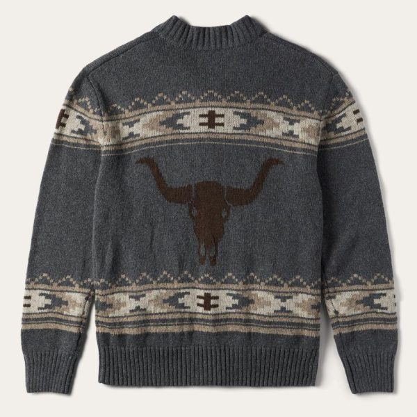 This grey zip-front cardigan sweater gives a nod to Stetson’s long-standing Western heritage with a Longhorn Steer motif alongside an Aztec-inspired print. It has two front hand pockets and a self-knitted collar, cuffs and waistband. Made from a wool blend, it provides warmth, comfort, and a dose of rugged style.