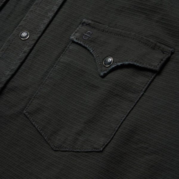 This charcoal grey corded denim shirt is crafted from yarn-dyed 100% cotton denim. It features a one point curved back yoke, the Stetson “S” embossed on the front left pocket, and “STETSON” embossed on the right sleeve placket. The classic snap front features variegated logo snaps, while the three snap cuff offers a secure fit. Cut trim for a modern fit.