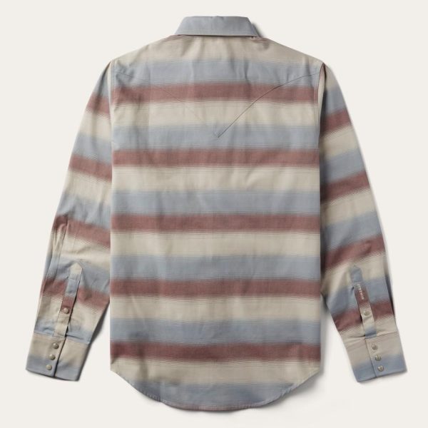 This Western-style shirt features our exclusive Ombre Stripe print and has a trim, modern fit. Authentic details include a one-point, ultra-deep back yoke, two front pockets, with one-point pocket flaps and three-snap cuffs. Subtly embossed Stetson logos on the chest pocket and sleeve placket along with striking interior paisley contrast trim add further style. Made from a sturdy 100% brushed twill cotton that hangs well while keeping its shape and only gets better with age.