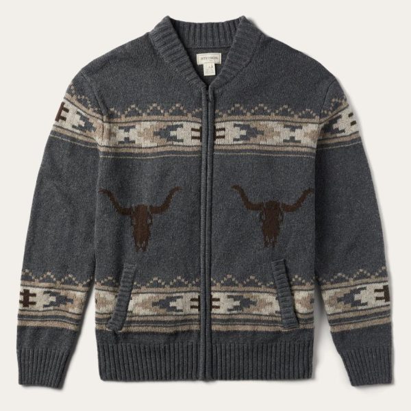 This grey zip-front cardigan sweater gives a nod to Stetson’s long-standing Western heritage with a Longhorn Steer motif alongside an Aztec-inspired print. It has two front hand pockets and a self-knitted collar, cuffs and waistband. Made from a wool blend, it provides warmth, comfort, and a dose of rugged style.