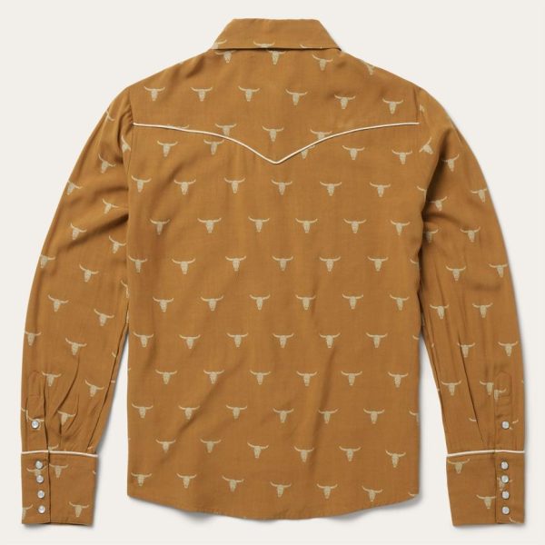 Fit for any cowgirl, this snap front blouse wears its Western influence proudly with an exclusive all-over Mojave steer head print and contrast cream-colored piping at the yokes and cuffs. Crafted of high-quality 100% flat rayon, it has a light, airy texture and a flattering fit that allows for freedom of movement. It features single point, deep curved front and back yokes and a single point left chest patch pocket.